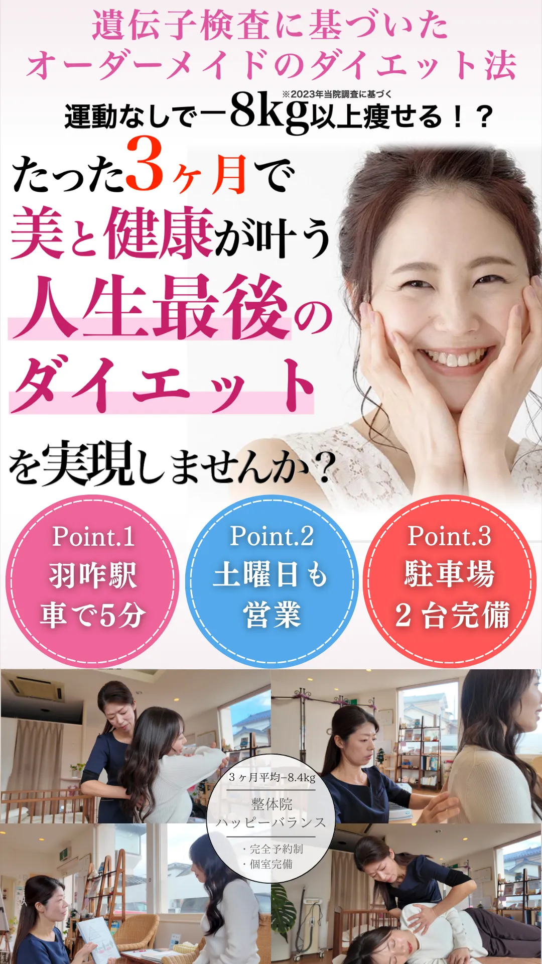 ダイエットのプロとしての証である資格を保有し、数多くのお客様から支持され、あなたの悩みに真正面から向き合う、整体院ハッピーバランスに来院し、健康と美容の先にある理想の自分を叶えて心から思いっきり楽しめる人生を手に入れる道。