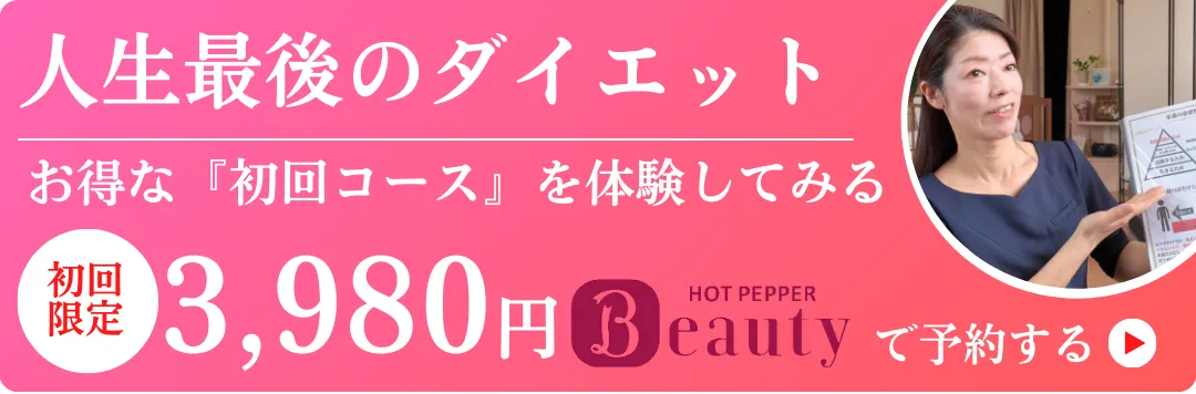 初回のカウンセリングなどを踏まえダイエット計画をお話させていただき、ご納得いただいてからダイエットコースの施術を行なっていきます!当店の人生最後のダイエットコースを「ぜひやってみたい!」思っていただいた方のみのご案内となりますので、お気軽にお越しください。